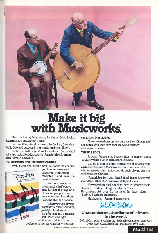 <ref name="mz23455-softsel-musicworks">{{cite magazine|name=Softsel Musicworks|date=Aug 1985|title=Softsel Musicworks|page=127|url=https://muzines.benhall.co.uk/ad/23455|magazine=International Musician & Recording World|publisher=Cover Publications Ltd, Northern & Shell Ltd.|location=United Kingdom|access-date=2026-04-25}}</ref>[{{cite magazine|name=Softsel Musicworks|date=Aug 1985|title=Softsel Musicworks|page=127|url=https://muzines.benhall.co.uk/ad/23455|magazine=International Musician & Recording World|publisher=Cover Publications Ltd, Northern & Shell Ltd.|location=United Kingdom|access-date=2026-04-25}}]