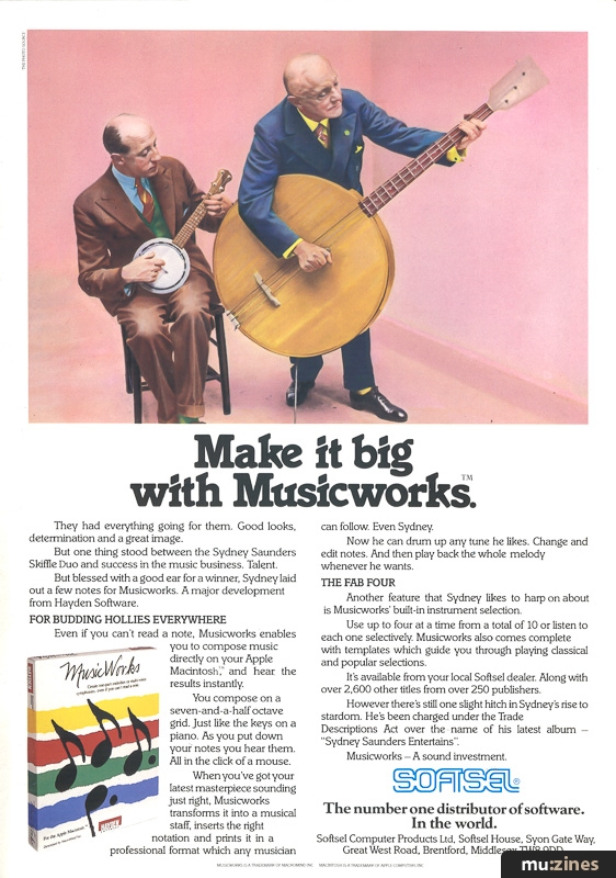 <ref name="mz5077-softsel-musicworks">{{cite magazine|name=Softsel Musicworks|date=Jun 1985|title=Softsel Musicworks|page=51|url=https://muzines.benhall.co.uk/ad/5077|magazine=Electronic Soundmaker & Computer Music|publisher=Cover Publications Ltd, Northern & Shell Ltd.|location=United Kingdom|access-date=2026-04-25}}</ref>[{{cite magazine|name=Softsel Musicworks|date=Jun 1985|title=Softsel Musicworks|page=51|url=https://muzines.benhall.co.uk/ad/5077|magazine=Electronic Soundmaker & Computer Music|publisher=Cover Publications Ltd, Northern & Shell Ltd.|location=United Kingdom|access-date=2026-04-25}}]