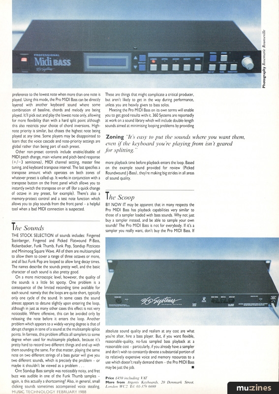 BY NOW IT may be apparent that in many respects the Pro MIDI Bass has playback capabilities very similar to those of a sampler loaded with bass sounds. Why not just buy a sampler instead, and be able to sample your own sounds? The Pro MIDI Bass is not for everybody. If it's a sampler you really want, don't buy the Pro MIDI Bass. If absolute sound quality and realism at any cost are what you're after, hire a bass player. But, if you want flexible, reasonable-quality, no-fuss sampled bass playback at a reasonable cost - particularly, if you already have a sampler and don't wish to constantly devote a substantial portion of its relatively expensive voice and memory resources to a use which doesn't really demand them - the Pro MIDI Bass may be just the job.