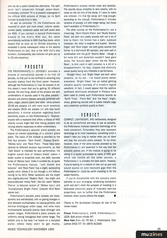 COMPACT, LIGHTWEIGHT, AND deliberately designed to be as non-technical and easy to use as possible, the Proformance modules represent technology at its most convenient. Fortunately they also represent technology at its most impressive, something which it doesn't take you long to realise when you sit down and play the acoustic piano presets. To my mind, however, none of the extra sounds provided by the Proformance/1+ are essential in the way that the acoustic pianos are. If the module is going to be sitting in a studio surrounded by racks of MIDI gear which can handle all the other sounds, a Proformance/1 is probably the best option. However, if you're looking for a module to take out as your only sound source on solo keyboard gigs then the Proformance/1+ could be worth investing in for the added flexibility.