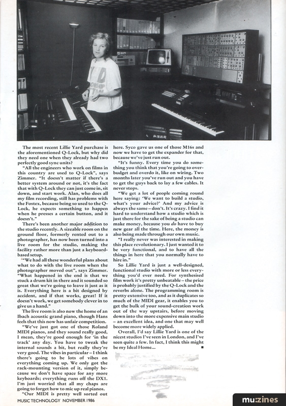 Lillie Yard Studio | Hans ZimmerArticle from Music Technology, November 1986 | |