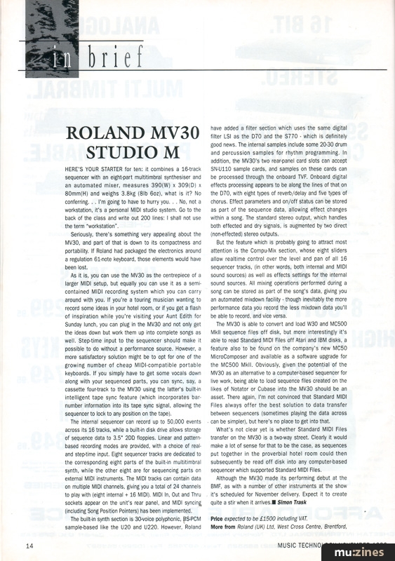 Unveiled at this year's BMF, Roland's MV30 combines a sequencer, multitimbral synthesiser and an automated mixer in a single unit. Simon Trask previews a new direction in synth technology. |