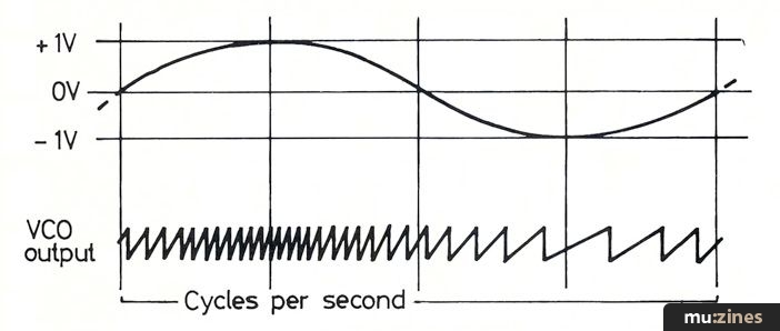 The principle is based on the theory that applying a voltage to any voltage-controlled unit will have some sort of effect on that unit. In other words, if you apply a rising and falling voltage to the voltage control input of an oscillator, the pitch of that oscillator will rise and fall accordingly (and for those for whom even a thousand words cannot convey an image accurately, this action is shown in Figure 1).