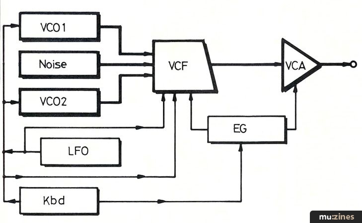 Figure 2, meanwhile, shows the basic layout of a typical synthesiser in the form of a block diagram. Boxes with a heavy outline show the path of the audio signal, while those with a lighter border indicate purely controlling modules. Turning our attention first of all to the audio signal, it's useful to remember that any sound is made up of three different components - pitch, tone and amplitude. An analogue synth allows you control of these parameters through its VCO, VCF and VCA sections, and the signal passes through these oscillators, filters and amplifiers in turn.