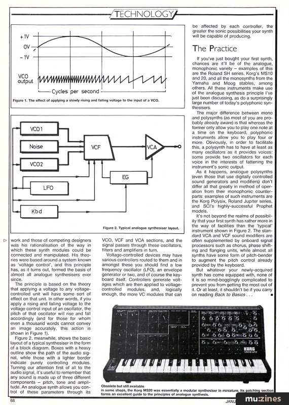 If you've just bought your first synth, chances are it'll be of the analogue, monophonic variety - examples of this are the Roland SH series, Korg's MS10 and 20, and all the monosynths from the Yamaha and Moog stables, among others. All these instruments make use of the analogue synthesis principle I've just been discussing, as do a surprisingly large number of today's polyphonic synthesisers.