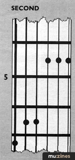 In fact we were gathered round the office hi-fi hunting for the edit on the Simple Minds live album (where it jumps from a French gig to an Australian gig, virtually between notes). "Hang on," we quoth, "thassa nice coupla chords." And indeed they are. This is what we think Charlie Burchill is playing, with loads of echo and a few picky notes in between, on the closing stages of 'Big Sleep'. Broken right down, they're just nice inversions of a major and a minor, but the secret is in the bass note. Listening to the album, we think Charlie is probably playing the top four strings, and leaving the bass to John Giblin. But with these fingerings here you can do the whole job yourself, oh efficient ones. Let the chords hang, and wobble your wang bar, if you've got one.