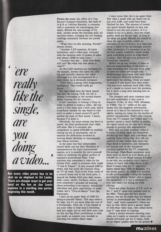 I must stress that this is an upper limit. The video I made with my band cost us just over £100, and could have been finished for less. The amount of money you spend should depend on how you intend to use the end product. If it is simply to act as a demo, then the visual quality need not be too high, as long as the ideas are good. Should you intend to show the tape in public, either on television (if you're lucky), in a nightclub, or on a chain of the increasingly popular video jukeboxes, it's necessary to go for the best quality available, which means using something known as High-Band U-matic. This will give you pictures of 'broadcast' standard.