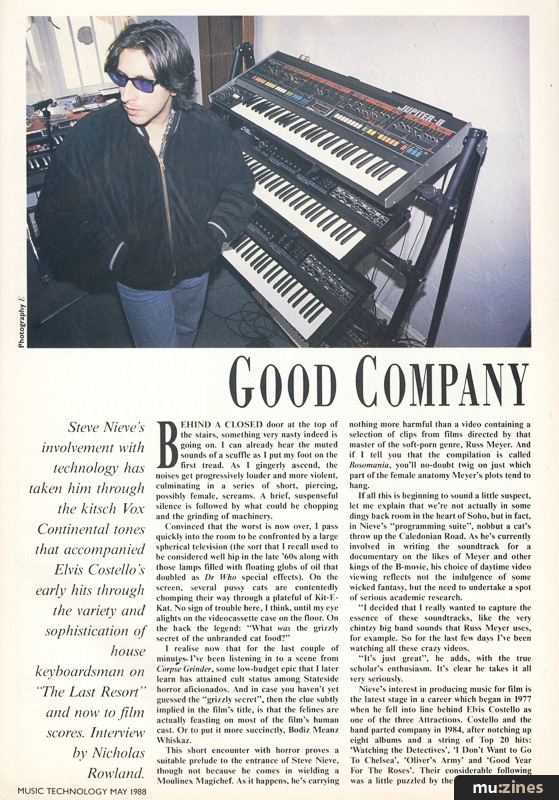 Steve Nieve's involvement with technology has taken him through the kitsch Vox Continental tones that accompanied Elvis Costello's early hits through the variety and sophistication of house keyboardsman on "The Last Resort" and now to film scores.