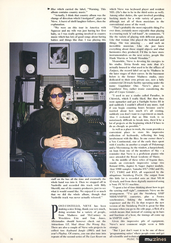 POST-COSTELLO, NIEVE has been making a nice living, thank you very much, doing sessions for a variety of people, from Madness and McCartney to Wreckless Eric and Tom Jones. Aficionados should however check out the Attractions LP, Mad About The Wrong Boy. There are also a couple of Nieve solo projects to collect too: Keyboard Jungle (1983) and last year's Playboy. Of course, you can also tune into repeats of the second series of The Last Resort on which Nieve was keyboard player and resident MD. (He's due to be in the third series as well). Among other duties, the spot involved providing backing music for a wide variety of guests - although not all of them musicians in the conventional sense of the word.