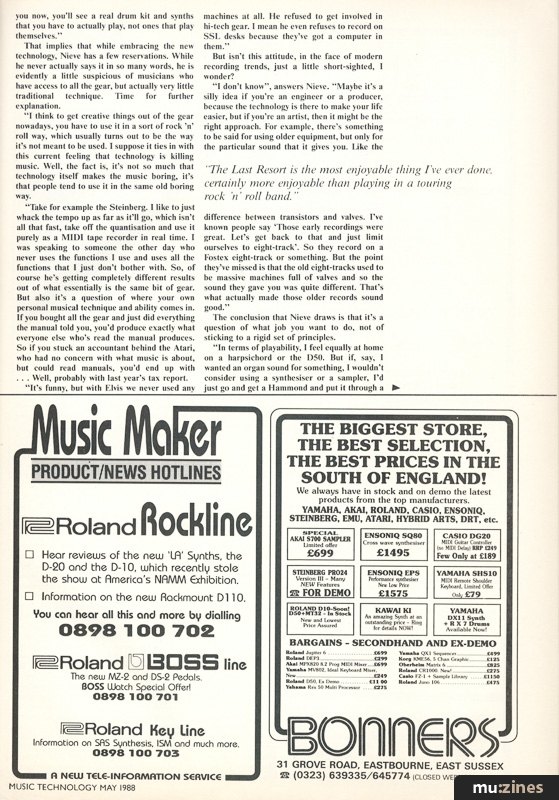 "In terms of playability, I feel equally at home on a harpsichord or the D50. But if, say, I wanted an organ sound for something, I wouldn't consider using a synthesiser or a sampler, I'd just go and get a Hammond and put it through a Leslie. To my ears, that's the only way you'd ever get a happening organ sound, so why bother with anything but the real thing. The Polymoog too has its uses. Like those 'Nutbush City Limits' sounds.