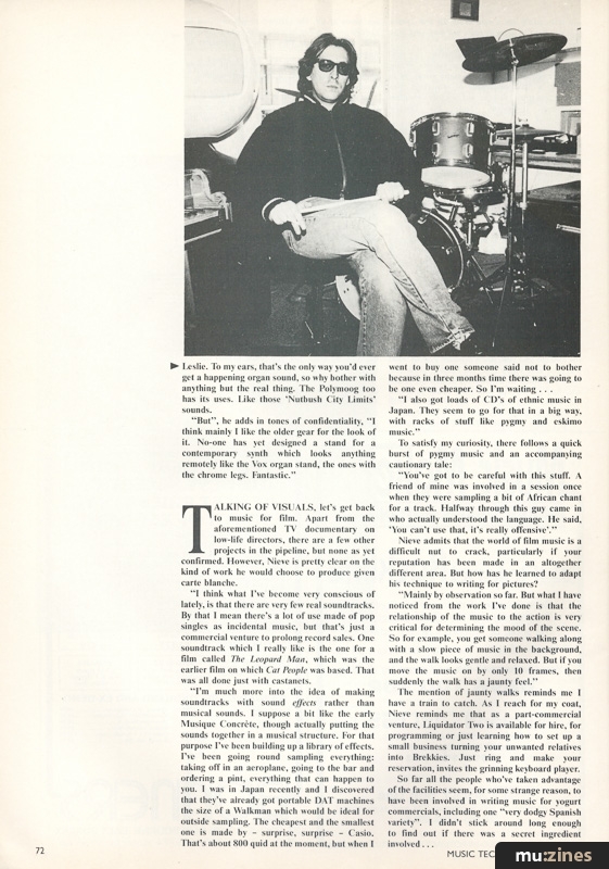 "I'm much more into the idea of making soundtracks with sound effects rather than musical sounds. I suppose a bit like the early Musique Concrete, though actually putting the sounds together in a musical structure. For that purpose I've been building up a library of effects. I've been going round sampling everything: taking off in an aeroplane, going to the bar and ordering a pint, everything that can happen to you. I was in Japan recently and I discovered that they've already got portable DAT machines the size of a Walkman which would be ideal for outside sampling. The cheapest and the smallest one is made by - surprise, surprise - Casio. That's about 800 quid at the moment, but when I went to buy one someone said not to bother because in three months time there was going to be one even cheaper. So I'm waiting...