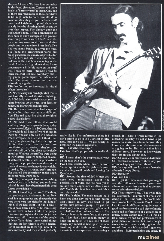 FZ: That's right. The main reason that I have not done any more is that people won't invest in any. I've tried to get several film projects going. I've got one that's very near completion right now; I need half-a-million dollars to finish it. I've already financed it myself up to this point and I just don't have enough money to finish the thing off. It's just one of those things, my capital is tied up in the new recording studio at the moment. Making a movie is more expensive than making a record. If I have a track record in the recording industry it's not so hard to get money to make an album because they know what the returns on the investment are going to be. But with a film it's a different story. They want to know where the stars are and all that shit.