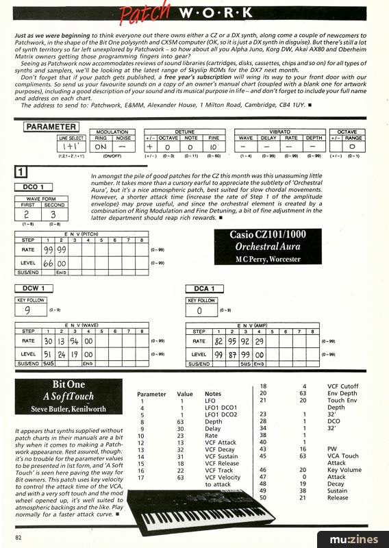 Just as we were beginning to think everyone out there owns either a CZ or a DX synth, along come a couple of newcomers to Patchwork, in the shape of the Bit One polysynth and CX5M computer (OK, so it is just a DX synth in disguise). But there's still a lot of synth territory so far left unexplored by Patchwork - so how about all you Alpha Juno, Korg DW, Akai AX80 and Oberheim Matrix owners getting those programming fingers into gear?