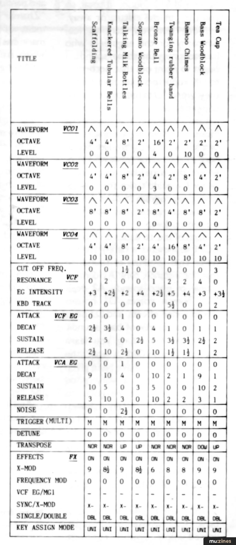 It's a long time since the Mono/Poly got a look in these pages, but we couldn't resist this oddball selection of bell md percussion sounds. Our favourite was 'Bamboo Chimes', but even the more obscure sounds have some musical use. Adrian waxes lyrical over them as follows: