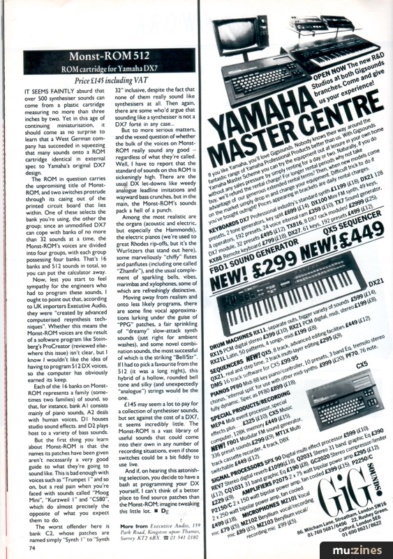 £145 may seem a lot to pay for a collection of synthesiser sounds, but set against the cost of a DX7, it seems incredibly little. The Monst-ROM is a vast library of useful sounds that could come into their own in any number of recording situations, even if those switches could be a bit fiddly to use live.