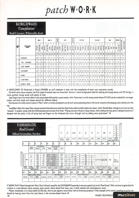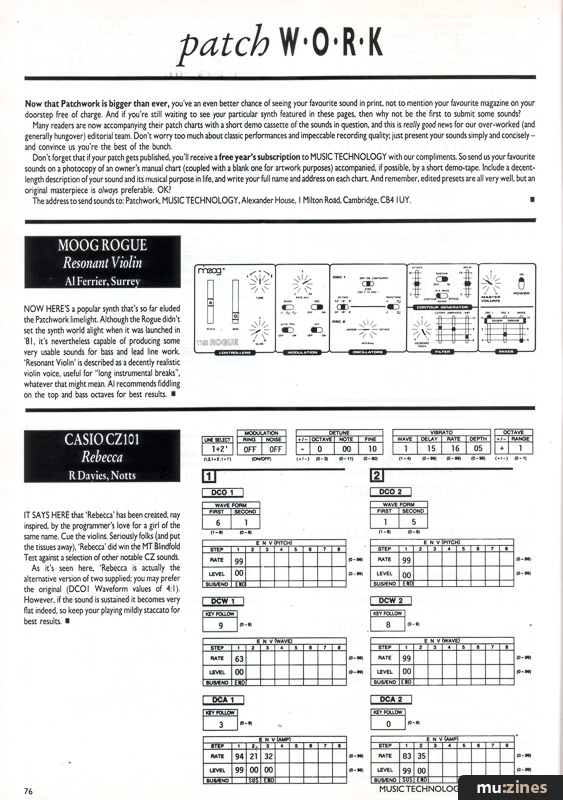 Don't forget that if your patch gets published, you'll receive a free year's subscription to MUSIC TECHNOLOGY with our compliments. So send us your favourite sounds on a photocopy of an owner's manual chart (coupled with a blank one for artwork purposes) accompanied, if possible, by a short demo-tape. Include a decent-length description of your sound and its musical purpose in life, and write your full name and address on each chart. And remember, edited presets are all very well, but an original masterpiece is always preferable. OK?