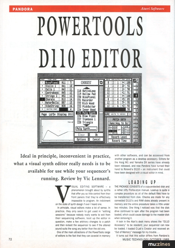 For those of you unfamiliar with the internal workings of a D110, a Timbre stores a Tone number along with various parameters for performance. This is because MIDI program changes can only handle up to 128 different selections, and as there are practically double that number of Tones in the D110, an alternative method of labelling had to be found, hence the use of Timbres. Pandora did not want to get involved with the complexities of Timbres and so this editor cannot assign Tones to Timbres, although the procedure on the D110 is a simple one and the data can then be transferred into the Atari. A shame in one respect, but it does make the editor easier to use, which is an important consideration.