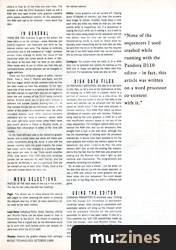 THERE ARE TWO methods to get to the editor; the Desk menu or via the hot-keys - press Alternate and Control together (not Alternate and Shift as the manual states) and voila. The display is relatively uncluttered due to the existence of "magic" windows whose titles change to show the value of the parameter when the cursor points at them. In fact, the layout is the best that I've seen on any editor. Other boxes wink at you to inform you that they are command boxes, whose selection can be changed, or toggle switches.