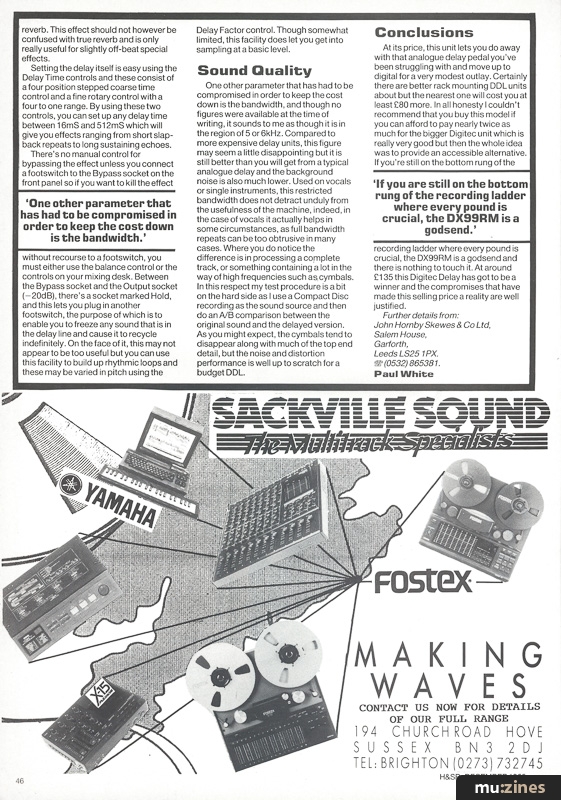 At its price, this unit lets you do away with that analogue delay pedal you've been struggling with and move up to digital for a very modest outlay. Certainly there are better rack mounting DDL units about but the nearest one will cost you at least £80 more. In all honesty I couldn't recommend that you buy this model if you can afford to pay nearly twice as much for the bigger Digitec unit which is really very good but then the whole idea was to provide an accessible alternative. If you're still on the bottom rung of the recording ladder where every pound is crucial, the DX99RM is a godsend and there is nothing to touch it. At around £135 this Digitec Delay has got to be a winner and the compromises that have made this selling price a reality are well justified.
