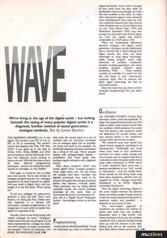 THE SALESMAN ASSURED you it was digital. The ad said it was FM, or LA, or PD, or VS or something. The owner's manual lists features like TVA, TVF, MG, DCW. If you grew up in the days of VCOs, VCFs, VCAs, ADSRs and LFOs you're looking in vain for old friends. If it's your first keyboard, you're sticking to factory sounds. Who has the time to learn all these different programming techniques - and you can always buy more sounds on cartridges, so why bother?