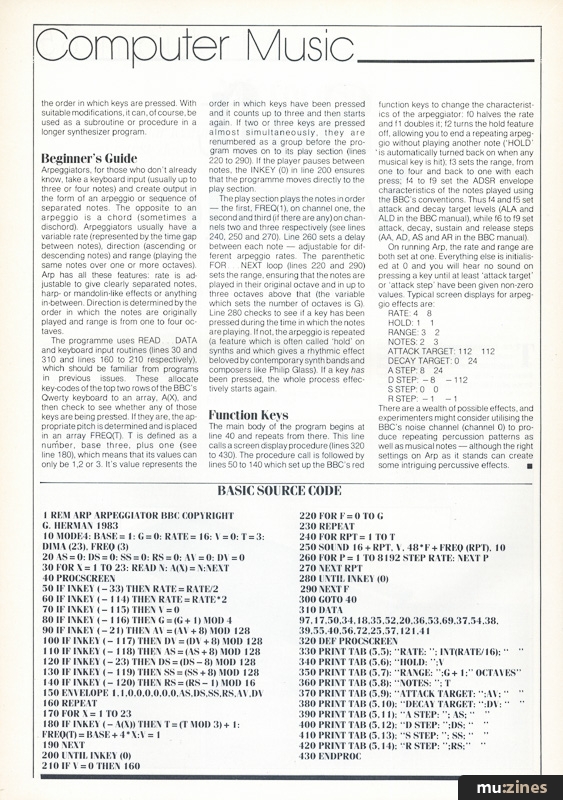 The main body of the program begins at line 40 and repeats from there. This line calls a screen display procedure (lines 320 to 430). The procedure call is followed by lines 50 to 140 which set up the BBC's red function keys to change the characteristics of the arpeggiator: f0 halves the rate and f1 doubles it; f2 turns the hold feature off, allowing you to end a repeating arpeggio without playing another note ('HOLD' is automatically turned back on when any musical key is hit); f3 sets the range, from one to four and back to one with each press; f4 to f9 set the ADSR envelope characteristics of the notes played using the BBC's conventions. Thus f4 and f5 set attack and decay target levels (ALA and ALD in the BBC manual), while f6 to f9 set attack, decay, sustain and release steps (AA, AD, AS and AR in the BBC manual).