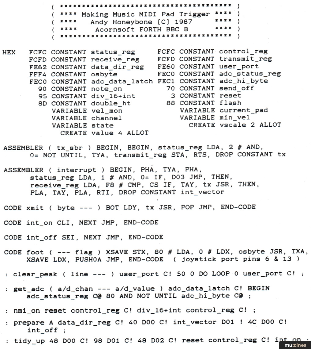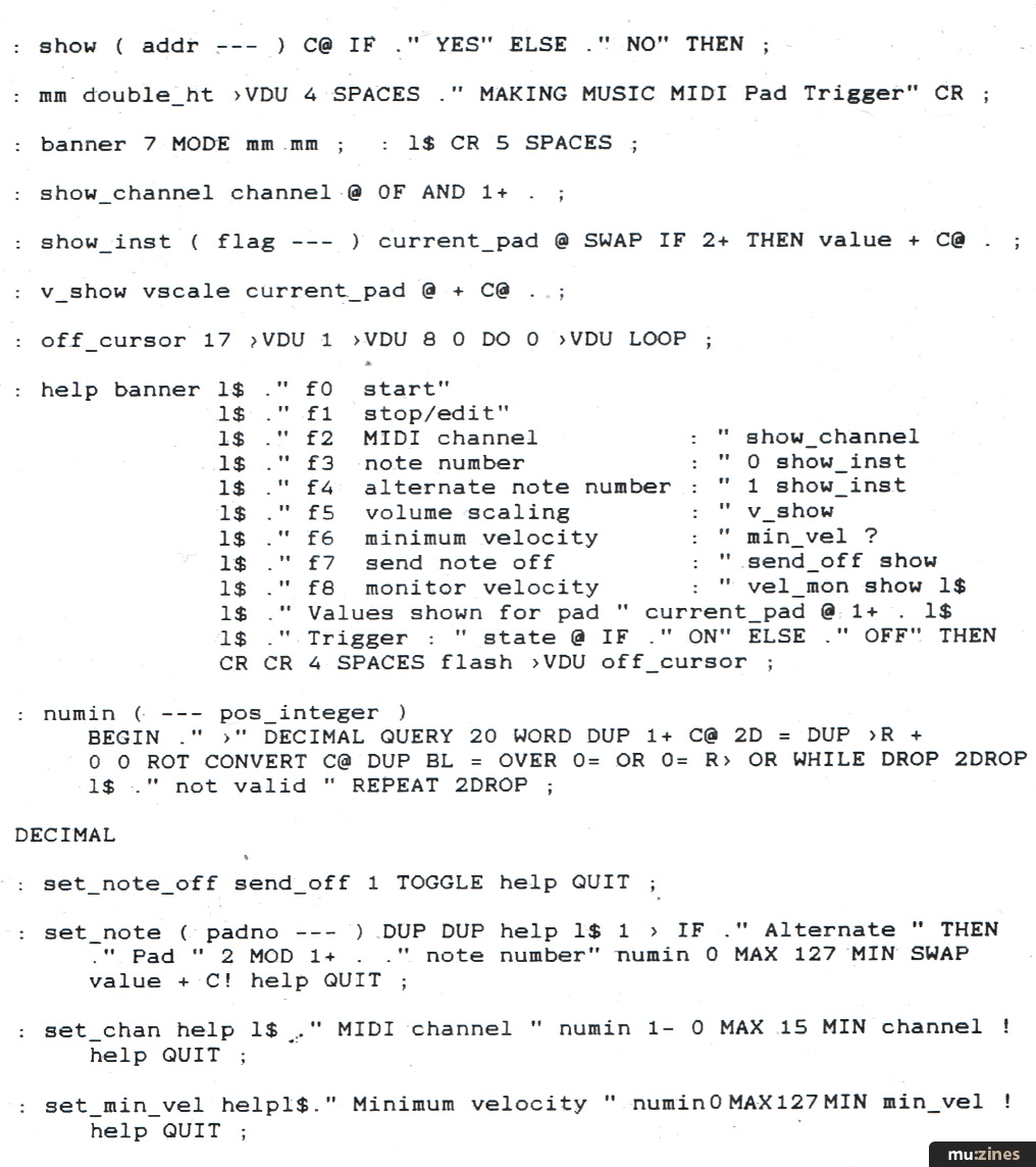 The definition 'help' displays which function keys do what, and gives the current settings for the selected pad. System Real-time MIDI messages are picked up and passed on by an assembler coded interrupt routine. Because all such messages are single bytes and may appear anywhere in a MIDI data stream, merging them with the trigger output is a trivial affair (unlike true MIDI merging). The interrupt vector is set up by the definitions 'prepar' and 'nmi.on' which also serve to condition the user port bit bit directions and turn off the Beeb's maskable interrupt response.
