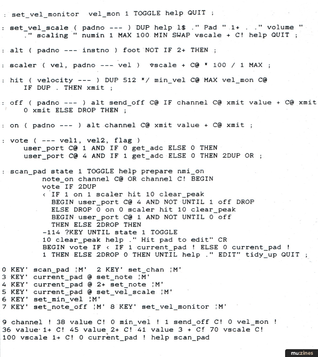 Continuing the description of 'scan, pad', the next line of code combines the MIDI channel number with the note on status — the transmit channel being a global value for all pads. The loop proper is then begun and a 'vote' is taken to see which pad, if any, has been hit the hardest. When two pads share a common stand, the cross-talk may be such that a signal of perhaps two-thirds the value of the struck pad may be generated from the other. Cross triggering is thus rife and made even worse when the pads are triggering toms which are the same sample replayed at different rates — the results are seldom those intended. The fierce but effective solution was found to be to trigger from only the loudest pad during any one scan. If you have good separation between your pads you might consider reconstructing the code too allow simultaneous hits to be detected.