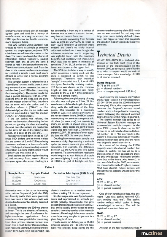 WHAT FOLLOWS IS a technical description of the SDS itself, given in the context of the implementation on the Prophet 2000, so as to get a sort of handle as to what a sampler would do with all these messages. Prior knowledge of MIDI is, of course, assumed.