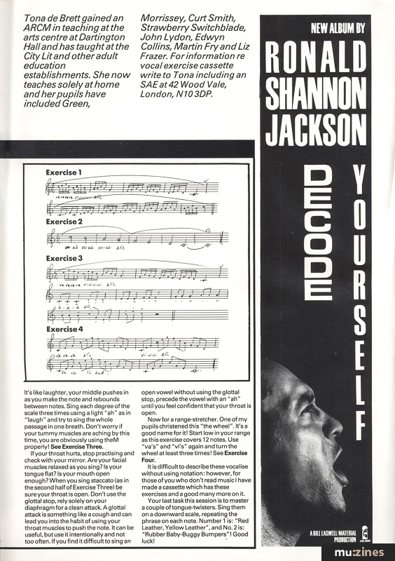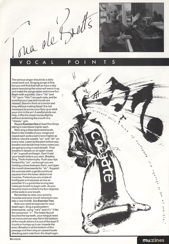 Tona de Brett gained an ARCM in teaching at the arts centre at Dartington Hall and has taught at the City Lit and other adult education establishments. She now teaches solely at home and her pupils have included Green, MorrisseyCurt Smith, Strawberry Switchblade, John Lydon, Edwyn Collins, Martin Fry and Liz Frazer. For information re vocal exercise cassette write to Tona including an SAE at (Contact Details).