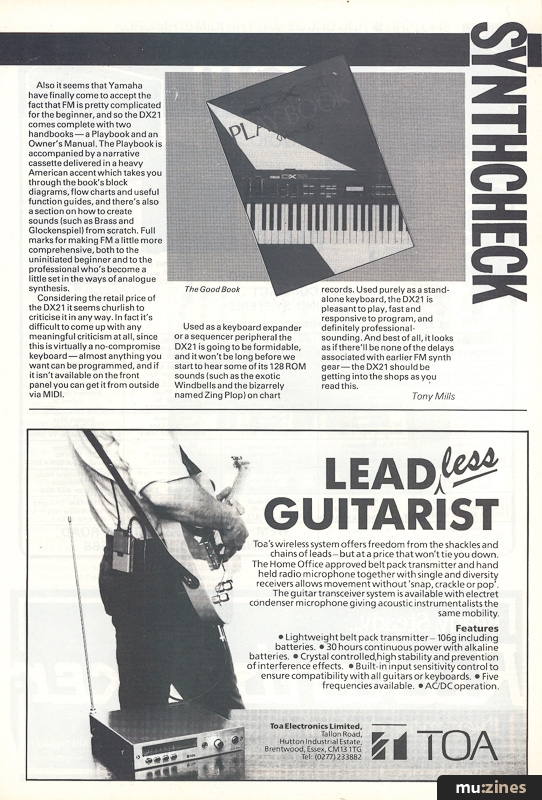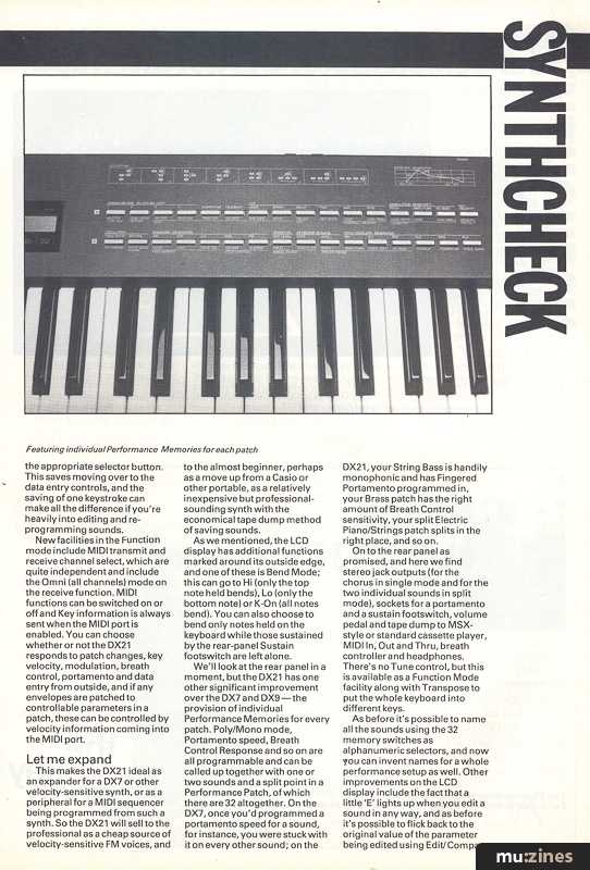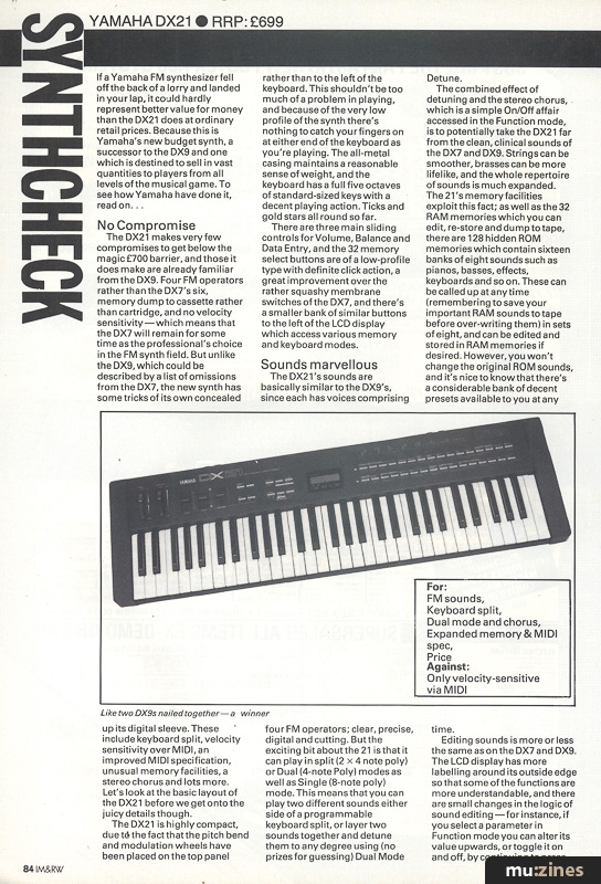 Used as a keyboard expander or a sequencer peripheral the DX21 is going to be formidable, and it won't be long before we start to hear some of its 128 ROM sounds (such as the exotic Windbells and the bizarrely named Zing Plop) on chart records. Used purely as a standalone keyboard, the DX21 is pleasant to play, fast and responsive to program, and definitely professional sounding. And best of all, it looks as if there'll be none of the delays associated with earlier FM synth gear — the DX21 should be getting into the shops as you read this.