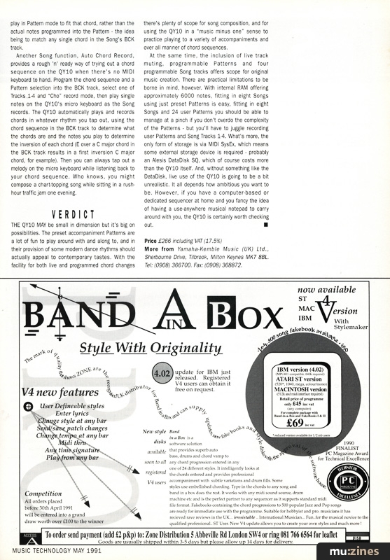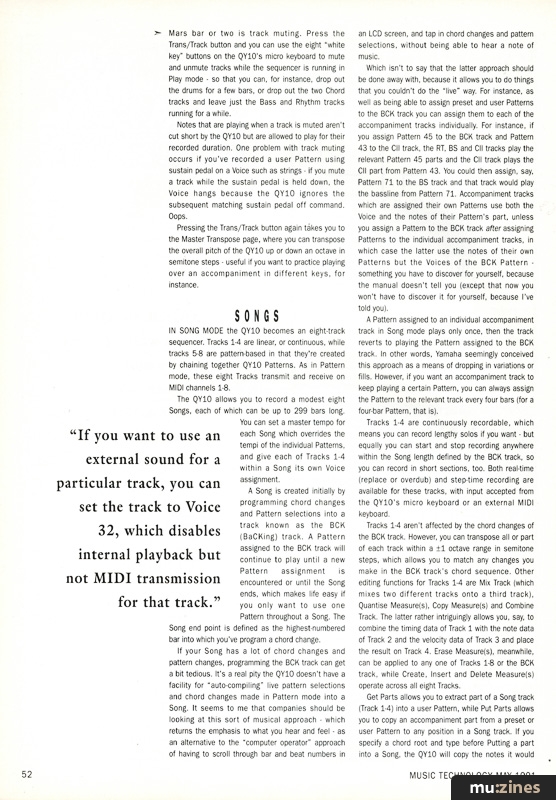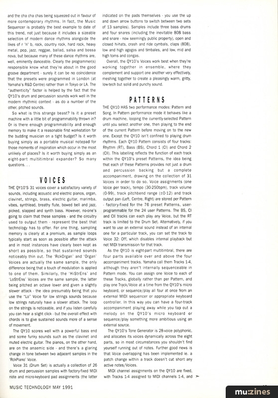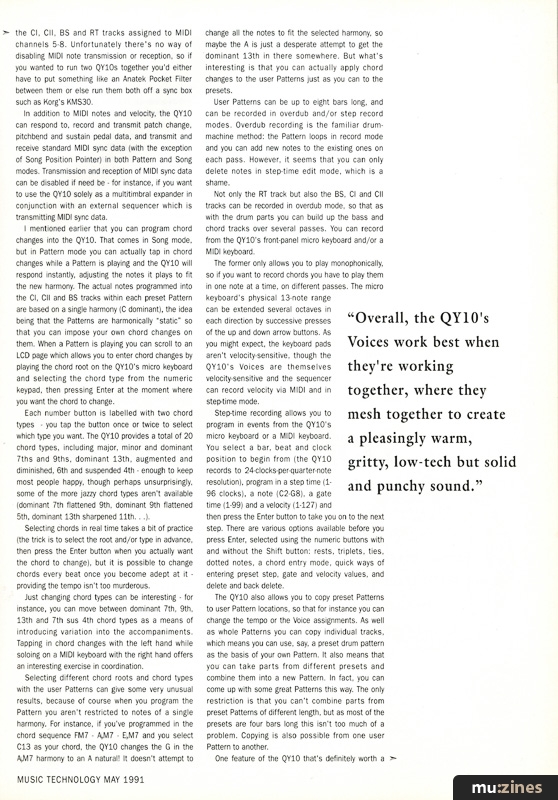 THE QY10 MAY be small in dimension but it's big on possibilities. The preset accompaniment Patterns are a lot of fun to play around with and along to, and in their provision of some modern dance rhythms should actually appeal to contemporary tastes. With the facility for both live and programmed chord changes there's plenty of scope for song composition, and for using the QY10 in a "music minus one" sense to practice playing to a variety of accompaniments and over all manner of chord sequences.