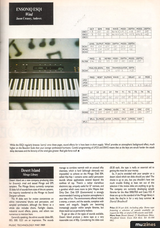 A review of the Desert Island sample collection for the Mirage joins readers' own patches for the Roland D110, Ensoniq ESQ1 and Casio CZ5000 in this month's action-packed edition of Patchwork. |