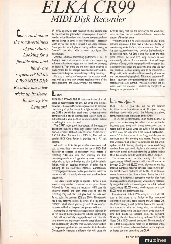 MIDI Disk RecorderMeanwhile, Elka have called their CR99 a MIDI Disk Recorder rather than a MIDI sequencer. Vic Lennard goes on record with a MIDI sequencer with a few surprises up its sleeve. |
