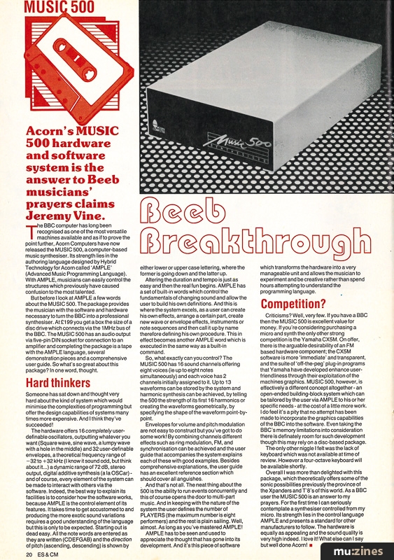 MUSIC 500Acorn's MUSIC 500 hardware/software package for the BBC micro could be the revolution micro musicians have been waiting for. |